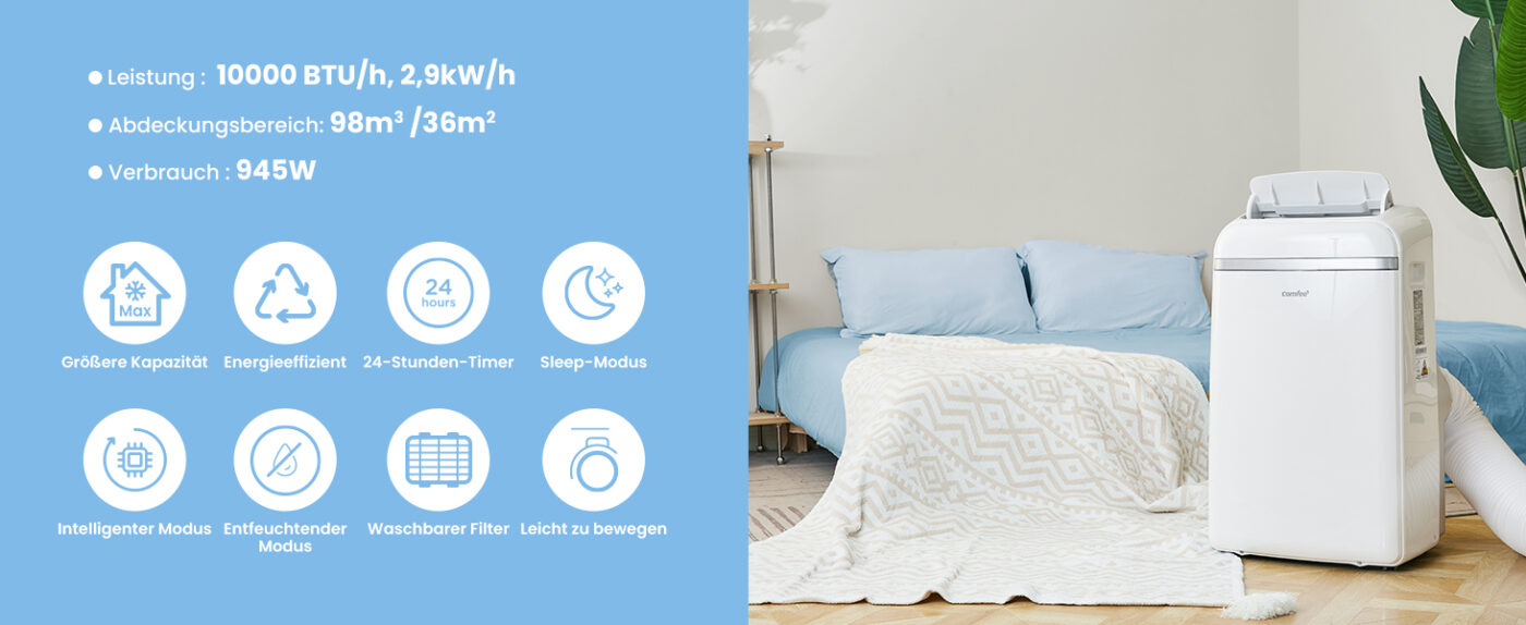 Genießen Sie optimalen Komfort mit unseren mobilen Comfee Klimageräten, darunter der Bestseller Easy Cool 2.6. Ideal für Räume bis zu 80m², vereinen unsere Klimageräte Leistung und Energieeffizienz.