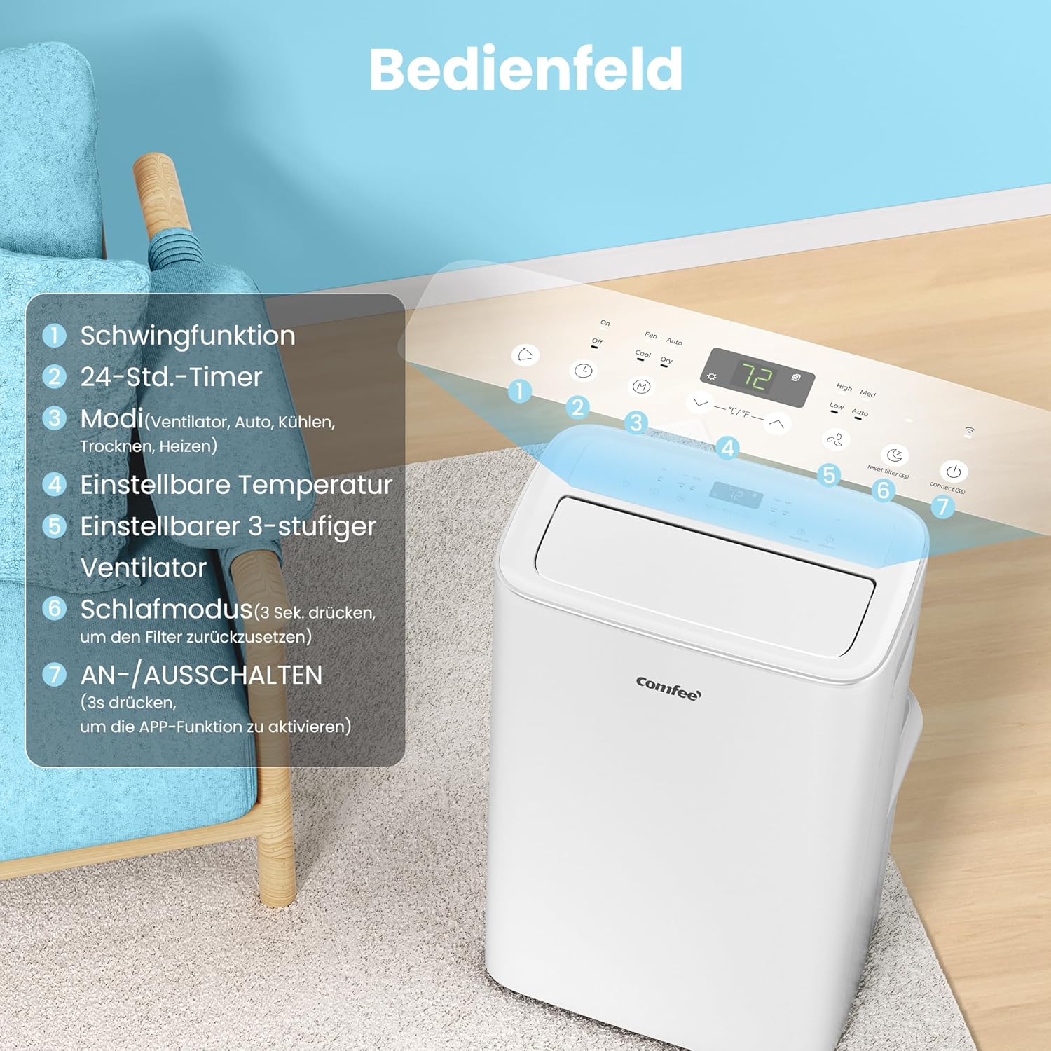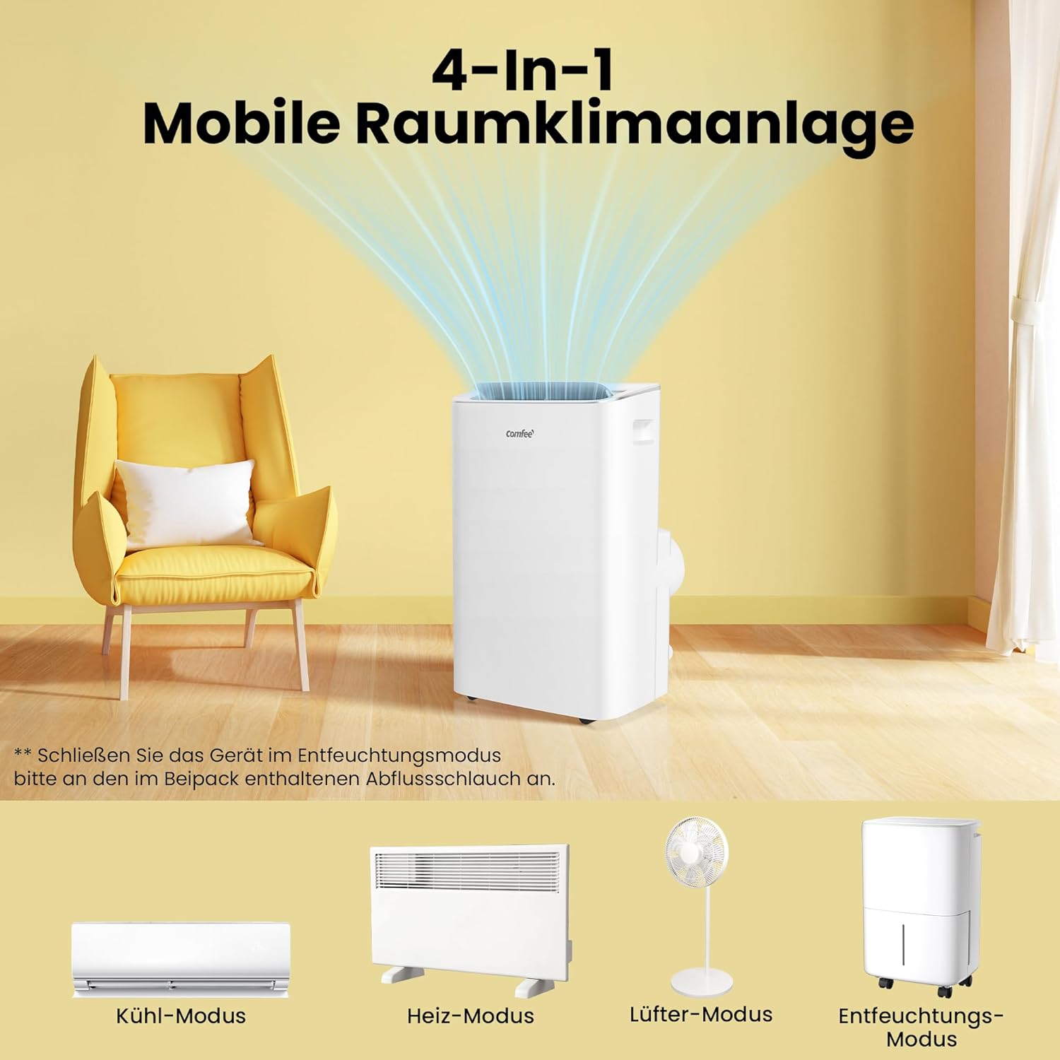 - 🔄 Modus wechseln – Kühlen, Entfeuchten oder Ventilieren