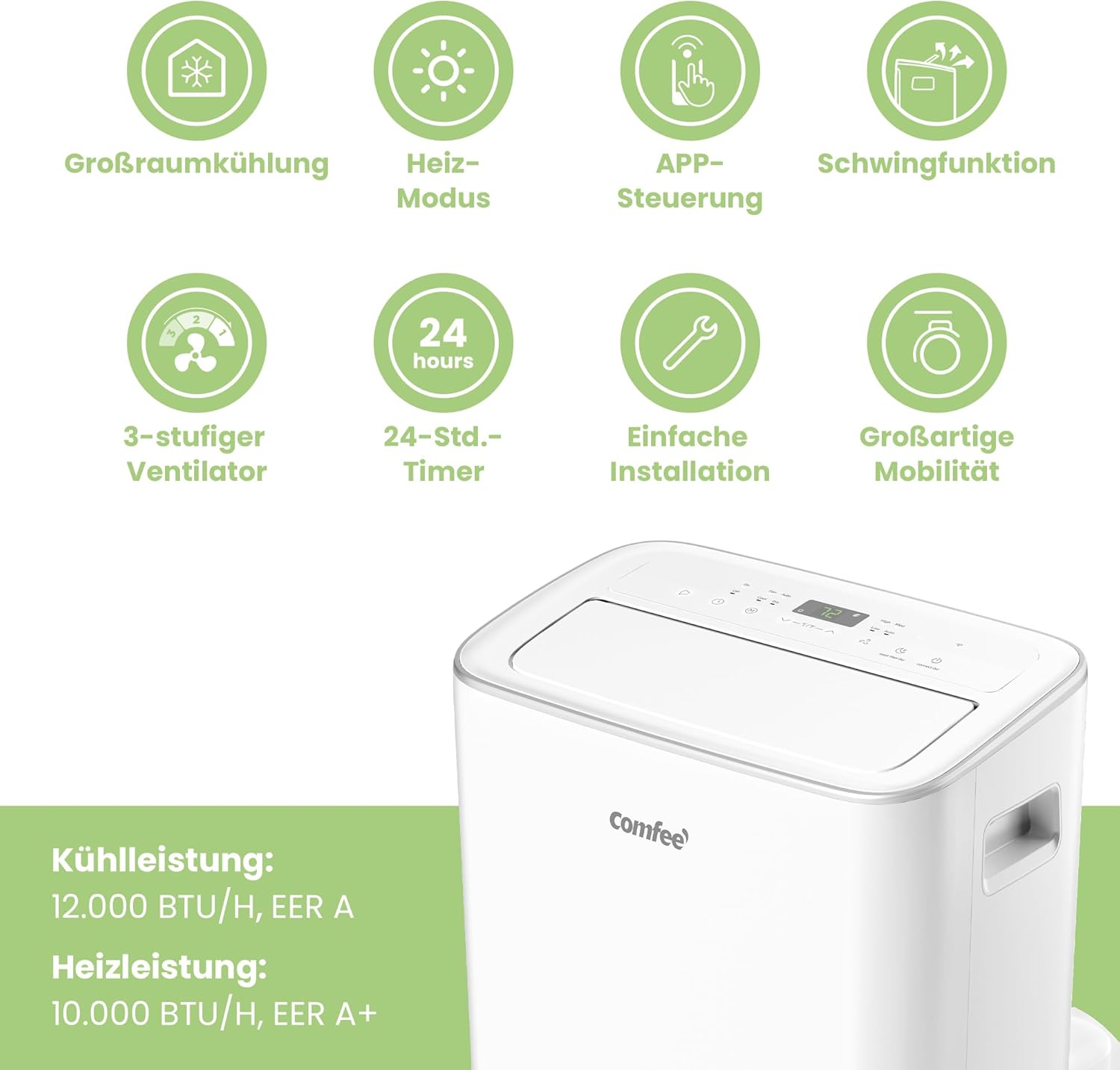 Das Comfee MPPF1-12CRN7 (Smart Cool 12000) – das leistungsstärkste mobile Klimagerät von Comfee mit 12000 BTU, WiFi-Steuerung, Alexa, Google Home und Auto-Swing. Nachfolger des beliebten MPD1-12CRN7. Entdecken Sie auch die komplette Comfee Klimageräte-Reihe, den Eco Friendly Pro mit Energieklasse A+, unsere Luftentfeuchter und Kühlschränke.