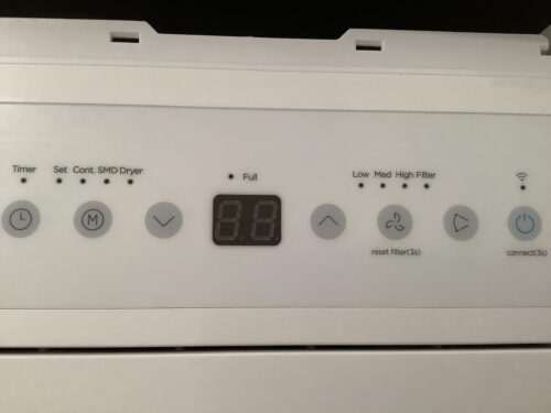 This dehumidifier is a great size for a living area or bedroom. It looks sleek and stylish in a white gloss colour and feels well made. Despite its large size it doesn’t feel obtrusive in the room. It is fairly weighty at approximately 10kg but does have caster wheels that attach on the bottom and make it easier to move around, especially on my laminated floors. There is no carry handle but can be pulled or lifted through holding the grooves near the top on either side, the power lead is long enough to keep the unit away from the walls. It has a digital display that shows the ambient humidity reading as well as the different settings and error codes. The modes can be chosen through the push buttons on the top, and include auto, dryer, silent (which stops the buttons beeping when pressed as opposed to making the unit run silently!), high & low fan settings and timers.