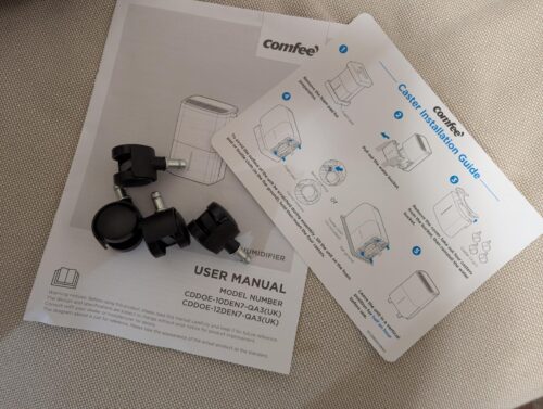 The wheels for the machine are stored inside the water collection basket so make sure you remove them before first use! They are simple to attach and make it easier to move about. It is quite heavy but compact and possible to lift up and carry around if necessary from room to room.