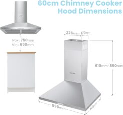 The COMFEE PYRA17B-60 is designed specifically for 60cm hobs. With dimensions of 598mm wide, it provides excellent coverage. For safe and effective operation, maintain the recommended distance between the hood and hob: