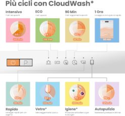 Un grande vantaggio è la tecnologia cloud wash che assicura una pulizia uniforme e accurata su tutti i livelli. L'opzione di asciugatura extra è perfetta per garantire che i piatti escano completamente asciutti, senza bisogno di ulteriori passaggi.