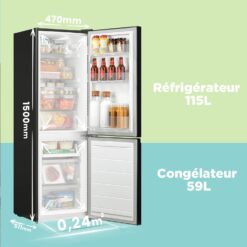 Avec ses 174 litres de capacité totale (115 L pour le réfrigérateur et 59 L pour le congélateur), il est parfait pour les petits espaces, les étudiants, les couples ou comme second réfrigérateur.